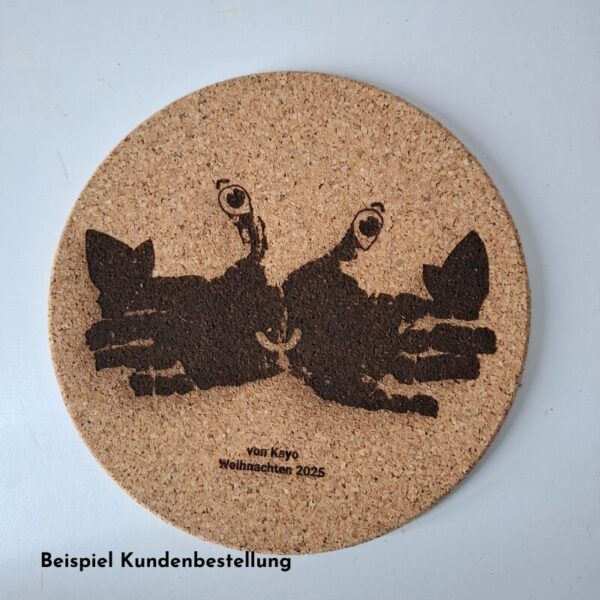 Wir versenden keinen Gut-zum-Druck. Der Text und/oder das Bild wird, wenn nicht anders gewünscht, zentriert auf den Untersetzer graviert. Bitte beachte, Kork ist ein Naturprodukt, mögliche kleinere Abweichungen, Helligkeitsstufen in der Gravur und Maserungen sind normal und kein Grund zur Reklamation. Personalisierte Produkte sind vom Umtausch ausgeschlossen.