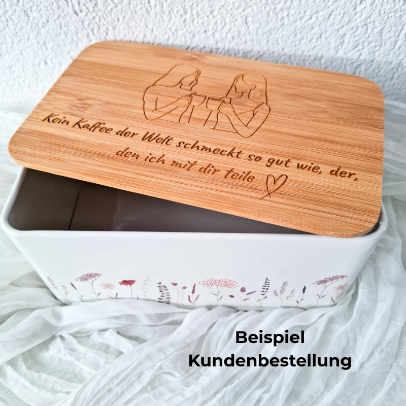 ⚠️ Hinweis: Bambus ist ein Naturmaterial. Maserung und Farbton können variieren. Dose und Deckel bitte nur mit einem feuchten Tuch reinigen, nicht in die Spülmaschine legen. Personalisierte Produkte sind vom Umtausch ausgeschlossen.