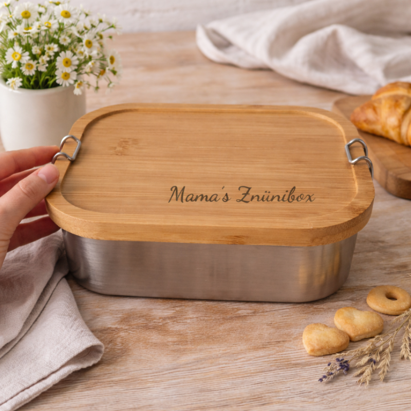 Durch die Gravur auf dem Bambusdeckel wird aus einer schlichten Brotdose ein persönliches Geschenk. Ob liebevolle Botschaft, kurzer Spruch oder individueller Name, die Lunchbox wird so zu einem täglichen Begleiter mit emotionaler Bedeutung.