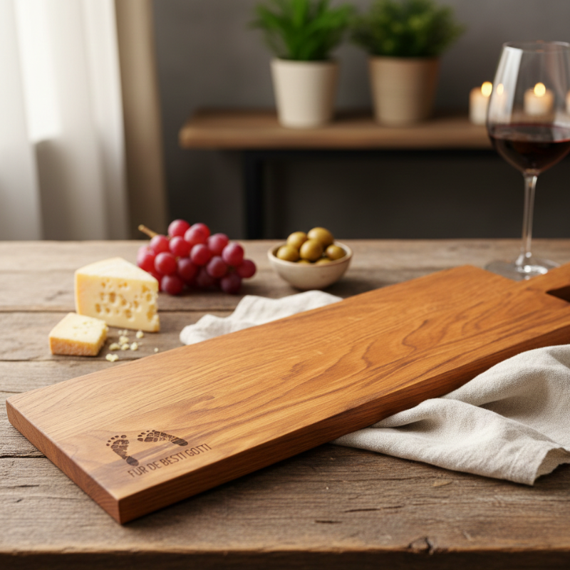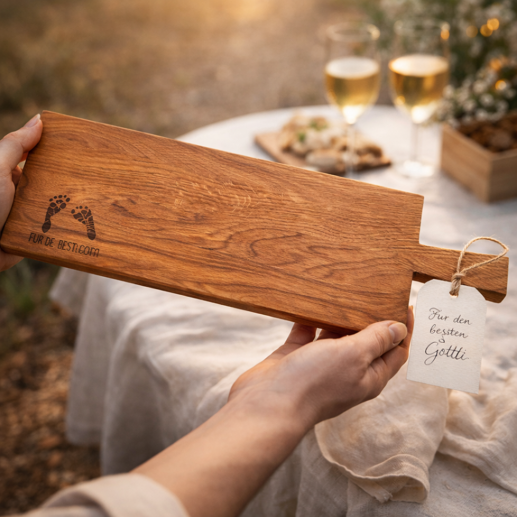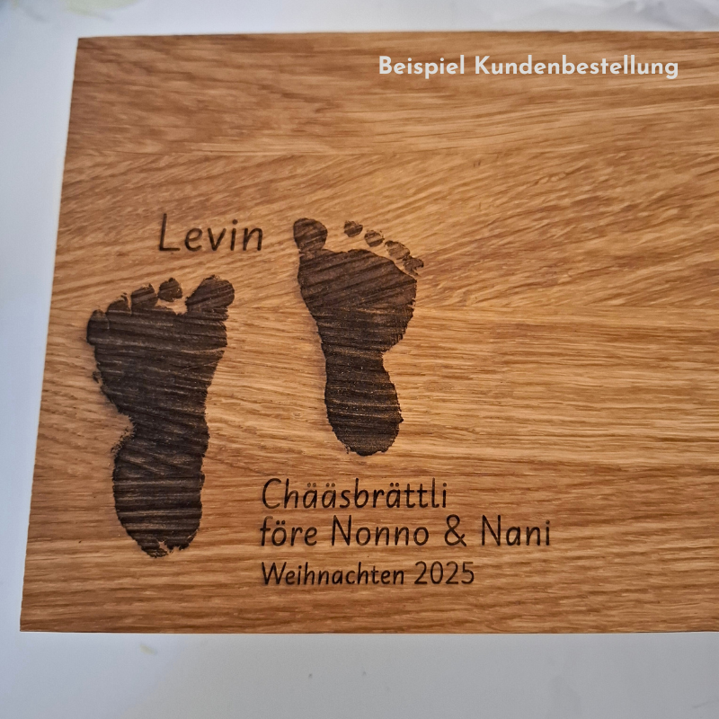 Viele suchen nach einem Geschenk, das nicht austauschbar ist. Standardisierte Produkte verlieren schnell ihre Bedeutung. Ein Hand- oder Fussabdruck dagegen ist einzigartig – er steht für eine bestimmte Lebensphase und einen unwiederbringlichen Moment. Dieses personalisierte Holzbrett löst genau dieses Geschenk-Problem: Es ist kein Dekorationsobjekt, sondern ein funktionales Apéro- oder Käsebrett, das regelmässig genutzt wird. Gleichzeitig bleibt die Gravur als Erinnerung dauerhaft sichtbar. Gerade als Geschenk zu Weihnachten, zum Geburtstag oder für Götti und Gotti entsteht so eine Verbindung aus Alltagstauglichkeit und emotionalem Wert. Für Schenkende ist es eine sichere Wahl: persönlich, hochwertig und langfristig nutzbar.
