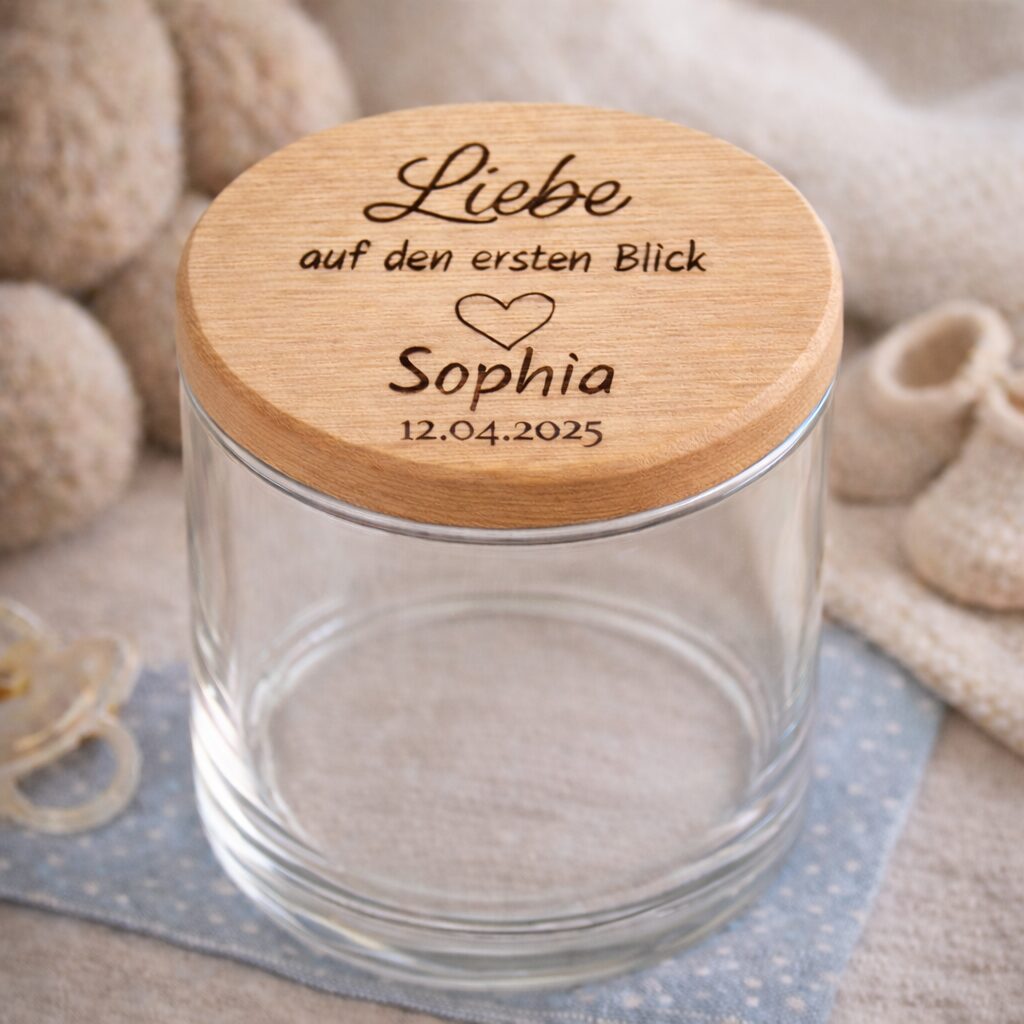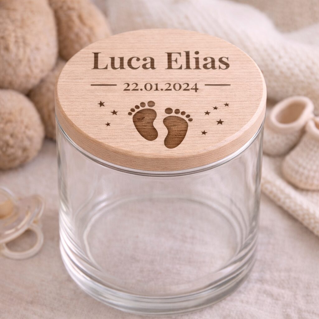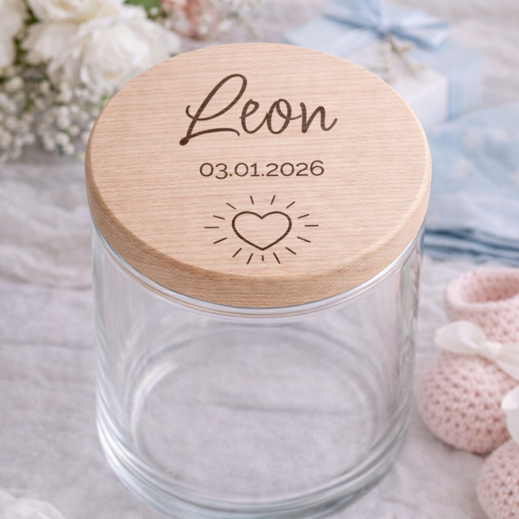 Dieses personalisierte Vorratsglas wurde als bewusstes Erinnerungsstück zur Geburt oder Taufe gestaltet. Der gravierte Holzdeckel trägt Name und Datum in einem unserer festen Motive und macht das Glas zu einem bleibenden Andenken an einen der wichtigsten Momente im Leben eines Kindes.