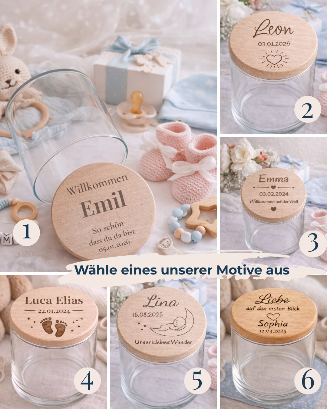 Viele Geschenke zur Geburt sind süss, aber austauschbar. Dieses Vorratsglas mit Gravur setzt bewusst auf Zurückhaltung, Materialqualität und eine klare Gestaltung. Die vorgegebenen Motive sind auf den Anlass abgestimmt und werden mit Name und Datum personalisiert, ohne Gestaltungsunsicherheit, ohne Upload-Risiko.