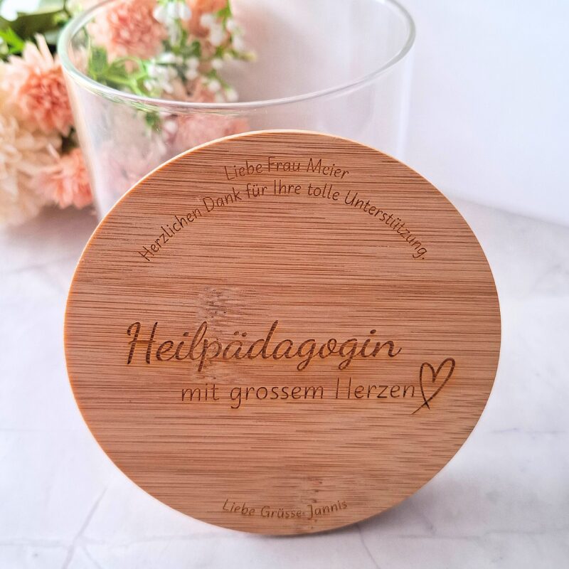 Manchmal sagt ein kleines Geschenk mehr als tausend Worte. Dieses Vorratsglas mit graviertem Wunschtext ist ein wunderschönes Dankeschön für ErzieherInnen, LehrerInnen oder die Spielgruppenleitung. Mit den Worten “Lehrerin mit Herz”, einem Herz-Symbol und einem individuellen Spruch oben und unten auf dem Holzdeckel wird es zu einer bleibenden Erinnerung an eine wertvolle gemeinsame Zeit.