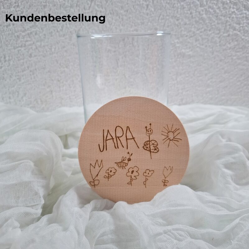 Kinderzeichnungen sind voller Liebe, Fantasie und Einzigartigkeit. Dieses Vorratsglas macht genau daraus ein bleibendes Erinnerungsstück. Die Zeichnung deines Kindes wird in den Holzdeckel graviert und so in ein persönliches Geschenk verwandelt, das Herz und Alltag gleichermaßen bereichert.