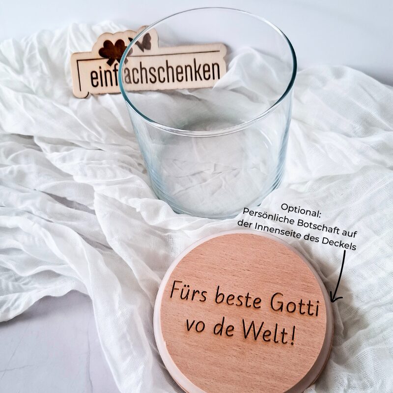 Ob als Geschenk für Gotti, Götti, Oma, Opa, Mama oder Papa – dieses Glas ist perfekt für Weihnachten, Geburtstage oder einfach, um von Herzen Danke zu sagen. Auf Wunsch kannst du im Inneren des Deckels zusätzlich eine persönliche Botschaft gravieren lassen.