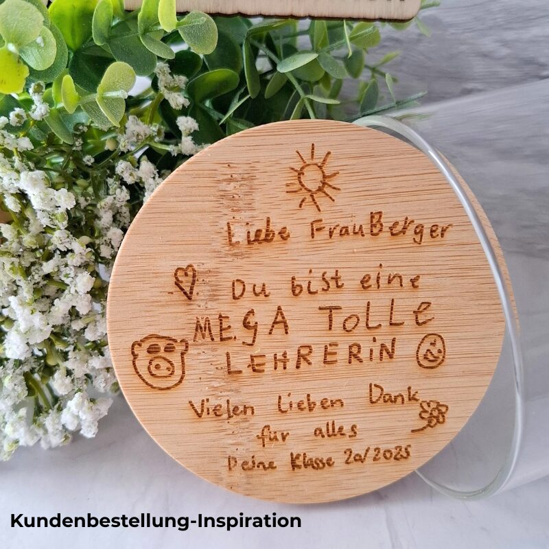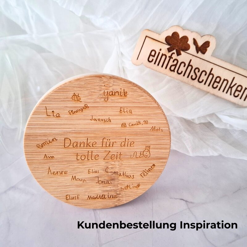 Ein Abschied in Schule, Kindergarten oder Kita ist ein ganz besonderer Moment. Dieses personalisierte Vorratsglas verwandelt die Unterschriften und Zeichnungen der Kinder in ein bleibendes Erinnerungsstück. Der Deckel aus graviertem Buchenholz macht jedes Glas zu einem Unikat voller Bedeutung.