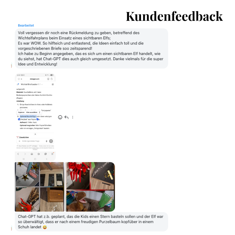 Ja. Mit dem digitalen Wichtel-Assistenten über ChatGPT kannst du ganz einfach eigene Ideen entwickeln, zusätzliche Briefe schreiben oder Texte individuell an dein Kind anpassen.